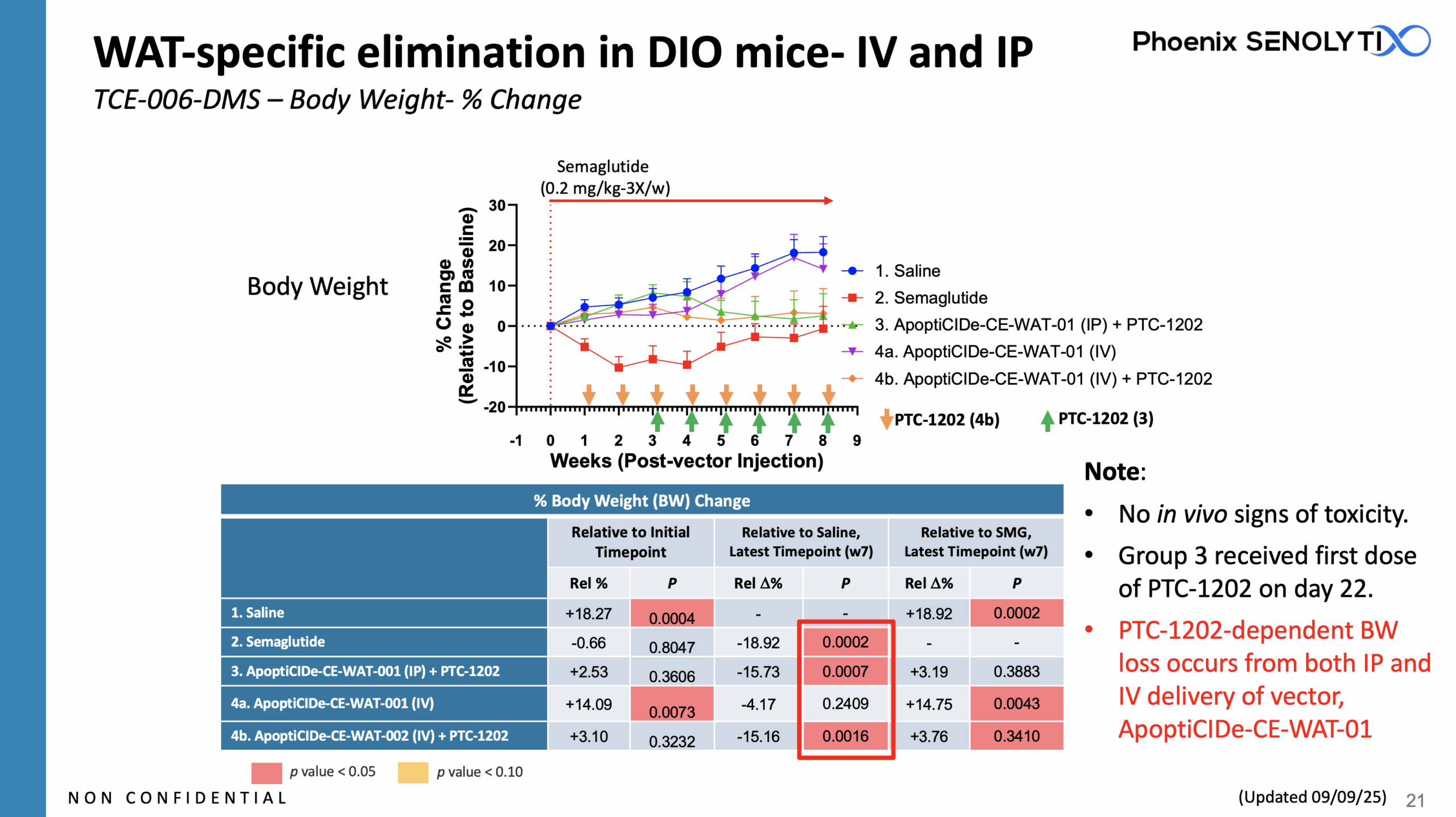 ApoptiCIDe-CE-WAT-001™️ vector was administered IP as indicated at a dose of 2.5E11 vg on Day 0